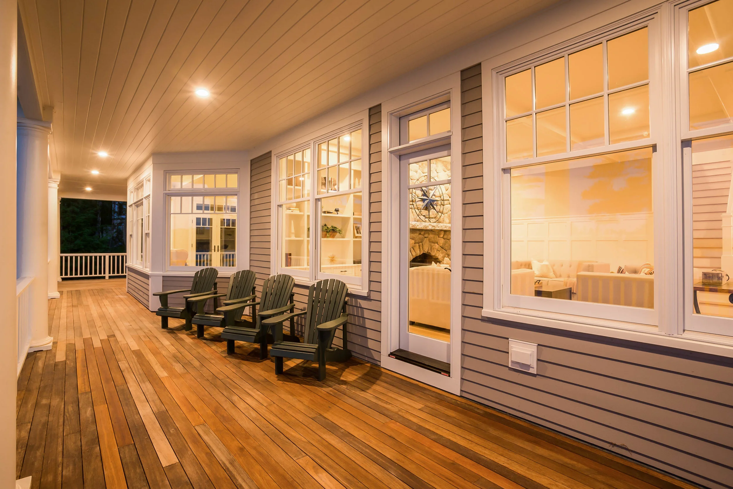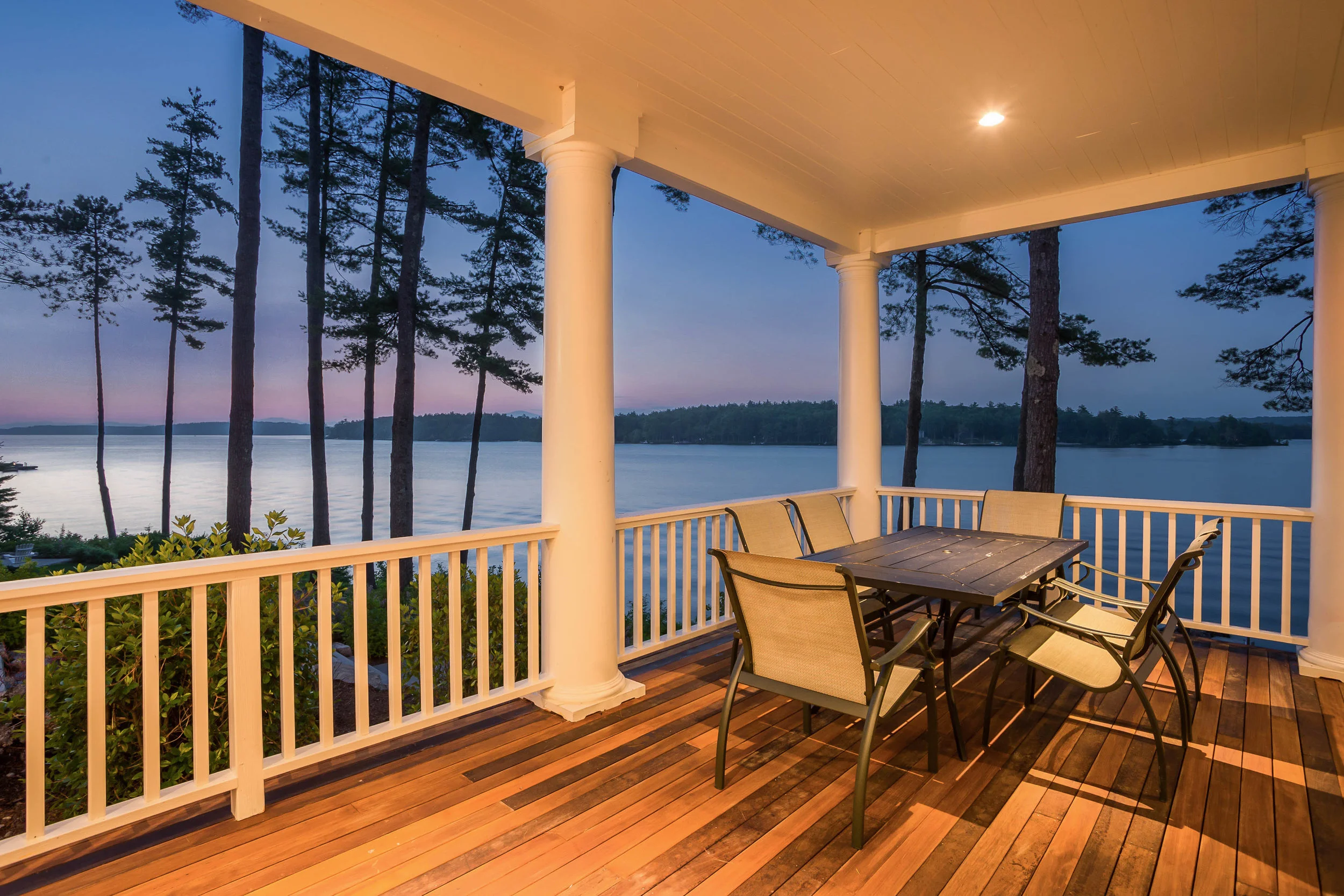 • Huge, wide wrap-around porch with expansive lake views; natural mahogany decking